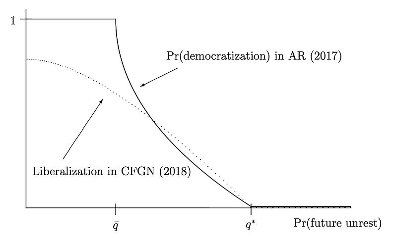 Here, a side note: It turns out that the central proposition in Acemoglu and Robinson’s “Why Did the West Extend the Franchise?” is incorrect. As Daron and Jim discuss in a research note from 2017, when the probability the excluded group poses a credible threat of unrest is neither too low nor too high, the government in fact mixes between democratizing and not democratizing, with positive probability of revolution on the equilibrium path. In a short paper, Paul, Eugene, Steve, and I show that this probability closely tracks the equilibrium level of representation in our extension of the Acemoglu-Robinson model.