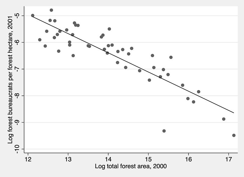 Regions with more forest acreage need fewer forest bureaucrats per acre. The log-log relationship is again remarkably linear—the signature of a power law.